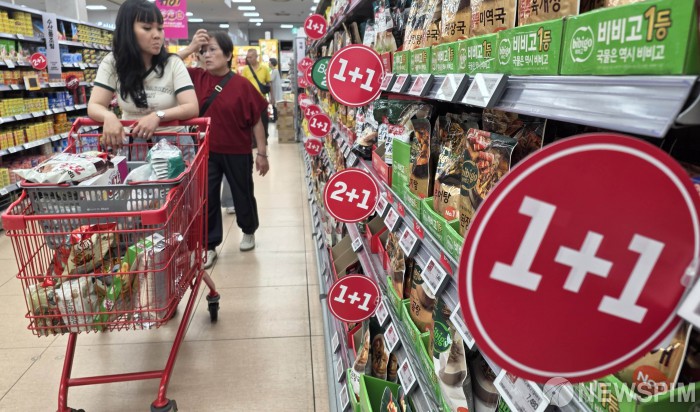 [서울=뉴스핌] 양윤모 기자 = 식품·유통업계가 물가 안정을 위해 라면·빵·김치등 가공식품의 '최대 반값' 할인 행사를 개최하는 가운데, 8일 오후 롯데마트 제타플렉스 서울역점을 찾은 소비자들이 쇼핑을 하고 있다. 2025.07.08 yym58@newspim.com