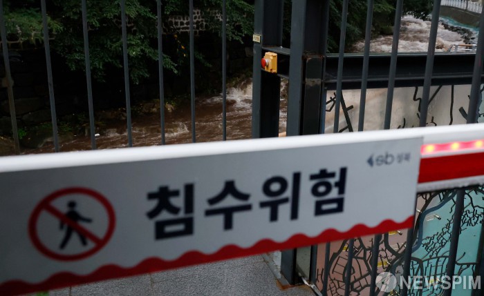 [서울=뉴스핌] 류기찬 인턴기자 = 밤사이 강한 비가 내린 가운데 17일 오전 서울 성북구 정릉천의 물이 불어나 출입이 통제되고 있다. 2025.07.17 ryuchan0925@newspim.com