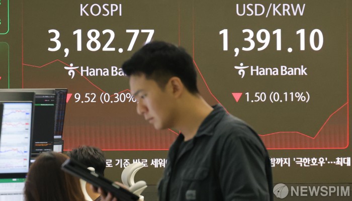 [서울=뉴스핌] 양윤모 기자 = 18일 오전 코스피가 전장 종가보다 9.52포인트(0.30%) 하락하며 3182.77로, 코스닥은 0.78포인트(0.10%) 상승한 819.05로 시작한 가운데, 서울 중구 하나은행 딜링룸에서 직원들이 업무를 보고 있다. 서울외환시장에서 원·달러 환율은 전장 대비 1.50원 하락한 1391.10원에 거래를 시작했다. 2025.07.18 yym58@newspim.com