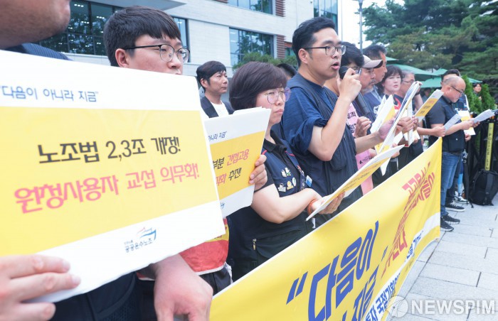 [서울=뉴스핌] 이길동 기자 = 민주노총 공공운수노조 조합원들이 18일 서울 종로구 정부서울청사 창성동 별관 국정기획위원회 앞에서 공공운수노조 비정규직 노동자들이 요구한다 “다음이 아니라 지금” 국정기획위원회 요구안 전달 기자회견을 하고 있다. 2025.07.18 gdlee@newspim.com