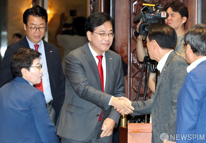 [서울=뉴스핌] 정일구 기자 = 송언석 국민의힘 비상대책위원장 겸 원내대표이 23일 오전 서울 여의도 국회에서 열린 의원총회에 참석하며 의원들과 인사를 나누고 있다. 2025.07.23 mironj19@newspim.com