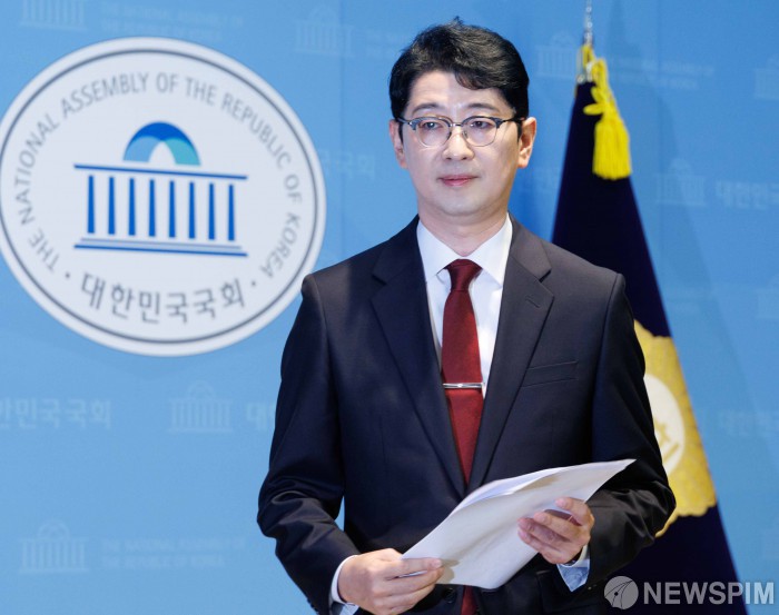 [서울=뉴스핌] 윤창빈 기자 = 주진우 국민의힘 의원이 24일 오전 서울 여의도 국회 소통관에서 당대표 출마 선언을 마치고 단상을 나서고 있다. 2025.07.24 pangbin@newspim.com