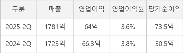 ◆ 2Q 실적, 매출액 1781억원 전년동기 대비 3.3% 증가... 영업이익 3.3% 감소