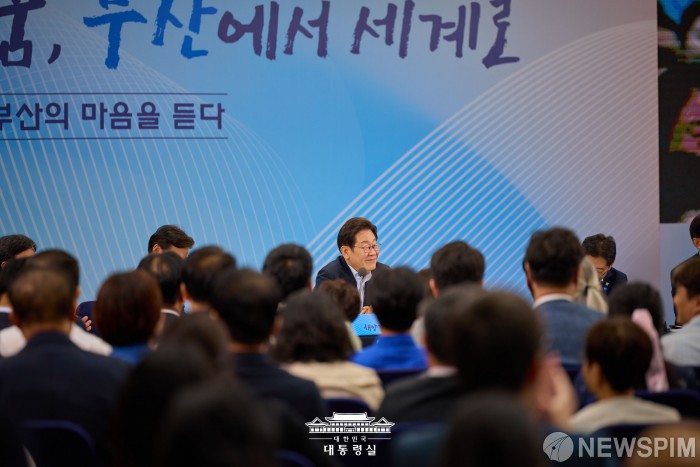 [서울=뉴스핌] 이재명 대통령이 25일 부산 부경대학교에서 열린 타운홀미팅 '부산의 마음을 듣다' 지역 주민 간담회에 자리하고 있다. [사진=대통령실] 2025.07.25 photo@newspim.com