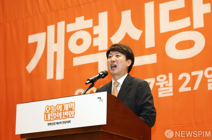 [서울=뉴스핌] 정일구 기자 = 이준석 개혁신당 대표 후보가 27일 오후 서울 여의도 국회 의원회관에서 열린 당대표·최고위원 선출 제2차 전당대회에서 정견발표를 하고 있다. 2025.07.27 mironj19@newspim.com