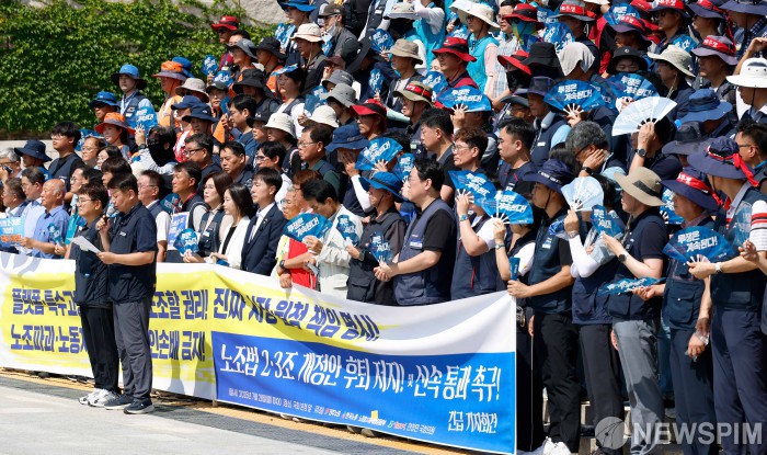 [서울=뉴스핌] 류기찬 인턴기자 = 민주노총·한국노총 조합원들을 비롯한 시민사회단체 회원들이 28일 오전 서울 여의도 국회의사당 본청 앞 계단에서 '노조법 2·3조 개정안 후퇴 저지 및 신속 통과 촉구 기자회견'을 열고 있다. 2025.07.28 ryuchan0925@newspim.com