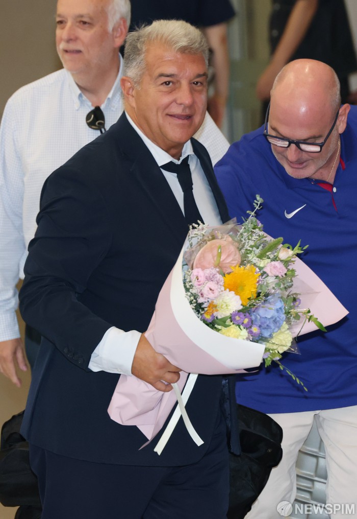 [영종도=뉴스핌] 김학선 기자 = 주안 라포르타 FC 바르셀로나 회장이 29일 오후 인천국제공항 2터미널을 통해 입국하고 있다. 지난 2010년 이후 15년 만에 한국을 찾은 바르셀로나는 오는 31일 오후 8시 서울월드컵경기장에서 K리그1 FC서울과 맞대결을 펼친 뒤 4일에는 대구FC와 친선경기를 치른다. 2025.07.29 yooksa@newspim.com