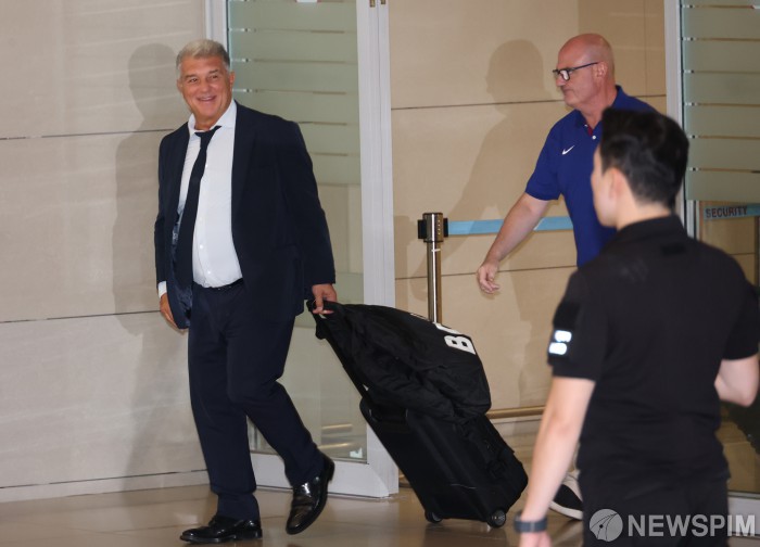 [영종도=뉴스핌] 김학선 기자 = 주안 라포르타 FC 바르셀로나 회장이 29일 오후 인천국제공항 2터미널을 통해 입국하고 있다. 지난 2010년 이후 15년 만에 한국을 찾은 바르셀로나는 오는 31일 오후 8시 서울월드컵경기장에서 K리그1 FC서울과 맞대결을 펼친 뒤 4일에는 대구FC와 친선경기를 치른다. 2025.07.29 yooksa@newspim.com