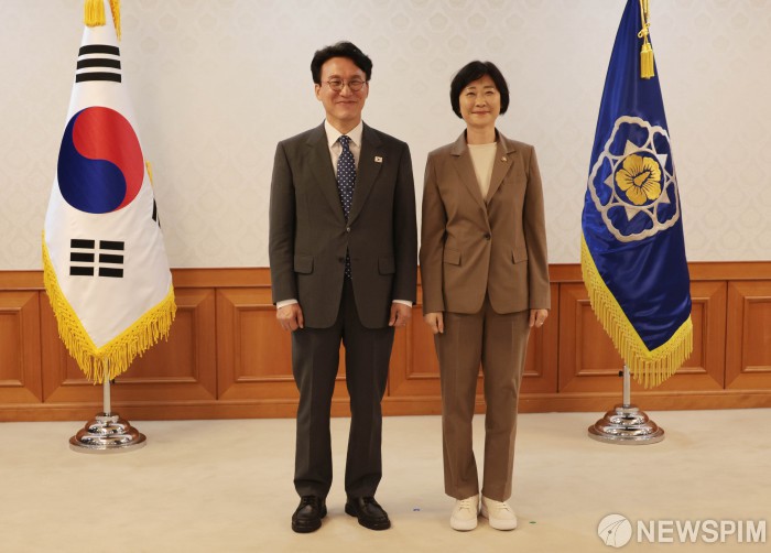 [서울=뉴스핌] 이길동 기자 = 김민석 국무총리가 31일 서울 종로구 정부서울청사에서 열린 차관급 임명장 수여식에서 이스란 보건복지부1차관에게 임명장 수여 후 기념촬영을 하고 있다. 2025.07.31 gdlee@newspim.com