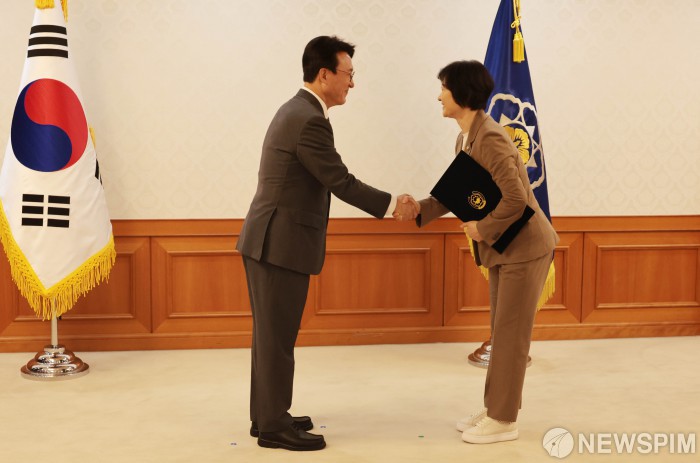 [서울=뉴스핌] 이길동 기자 = 김민석 국무총리가 31일 서울 종로구 정부서울청사에서 열린 차관급 임명장 수여식에서 이스란 보건복지부 1차관에게 임명장을 수여하고 있다. 2025.07.31 gdlee@newspim.com