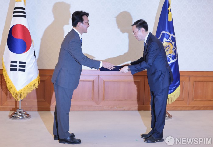 [서울=뉴스핌] 이길동 기자 = 김민석 국무총리가 31일 서울 종로구 정부서울청사에서 열린 차관급 임명장 수여식에서 이명구 관세청장에게 임명장을 수여하고 있다. 2025.07.31 gdlee@newspim.com