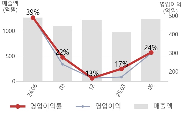 영업이익률을 자세히 살펴보면, 매출은 1230억으로 전년동기 대비해서 2.4% 감소한 반면, 영업이익은 297억으로 39% 감소하였다. 매출은 크게 변하지 않았지만 영업이익이 감소하여 영업이익률도 하락한 것을 알 수 있다.