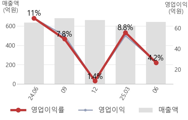 영업이익률을 자세히 살펴보면, 매출은 641억으로 전년동기 대비해서 0.8% 증가한 반면, 영업이익은 27억으로 61% 감소하였다. 매출은 크게 변하지 않았지만 영업이익이 감소하여 영업이익률도 하락한 것을 알 수 있다.