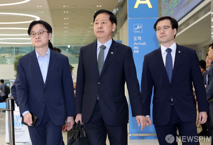 [영종도=뉴스핌] 정일구 기자 = 한미 관세 협상을 마친 구윤철 부총리 겸 기획재정부 장관과 김정관 산업통상자원부 장관, 여한구 통상교섭본부장 등 한국 협상단이 1일 오후 인천국제공항 제2여객터미널을 통해 귀국하고 있다. 2025.08.01 mironj19@newspim.com