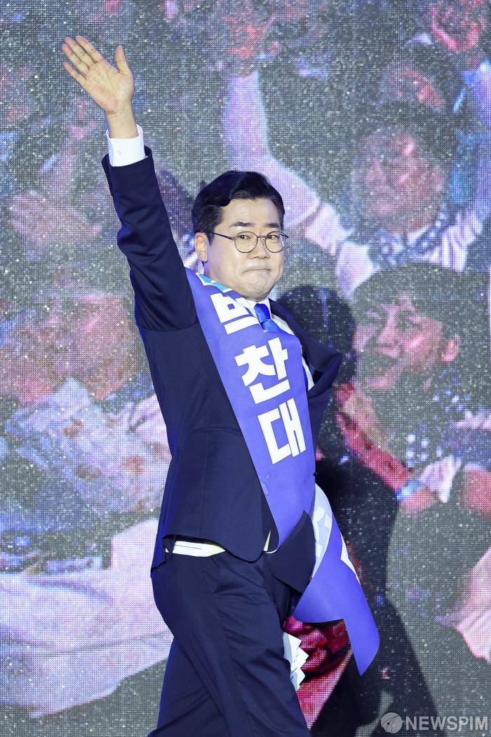 [고양=뉴스핌] 윤창빈 기자 = 박찬대 더불어민주당 당대표 후보가 2일 경기 고양시 킨텍스에서 열린 제2차 임시전국당원대회에서 정견발표를 마친 후 당원들을 향해 인사하고 있다. 2025.08.02 pangbin@newspim.com
