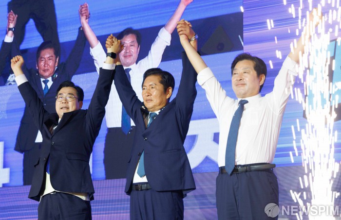[고양=뉴스핌] 윤창빈 기자 = 정청래 더불어민주당 신임 대표가 2일 오후 경기 고양시 킨텍스에서 열린 제2차 임시전국당원대회에서 황명선 신임 최고위원, 박찬대 후보와 인사하고 있다. 2025.08.02 pangbin@newspim.com