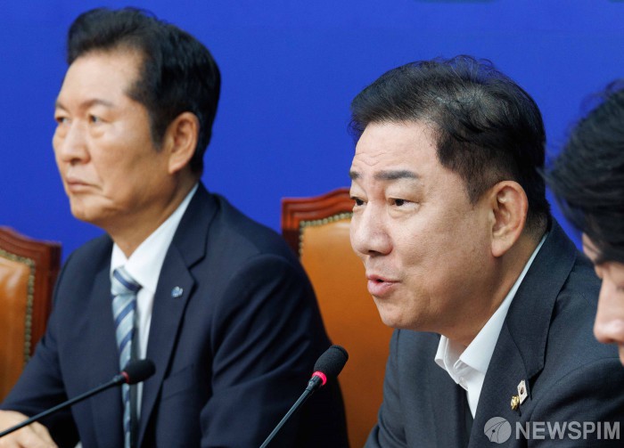 [서울=뉴스핌] 윤창빈 기자 = 김병기 더불어민주당 원내대표가 4일 오전 서울 여의도 국회에서 열린 최고위원회의에서 모두발언을 하고 있다. 2025.08.04 pangbin@newspim.com