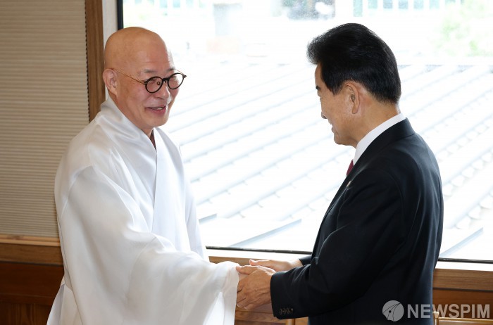 [서울=뉴스핌] 정일구 기자 = 정동영 통일부 장관이 4일 오전 서울 종로구 조계사를 찾아 조계종 총무원장인 진우스님과 인사를 나누고 있다. 2025.08.04 mironj19@newspim.com