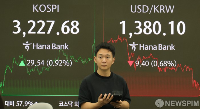 [서울=뉴스핌] 양윤모 기자 = 7일 오후 코스피가 전장 종가보다 29.54포인트(0.92%) 상승하며 3227.68로, 코스닥은 2.32포인트(0.29%) 상승한 805.81로 마감한 가운데, 서울 중구 하나은행 딜링룸에서 직원들이 업무를 보고 있다. 서울외환시장에서 원·달러 환율은 전장 대비 9.40원 하락한 1380.10원에 거래를 마감했다. 2025.08.07 yym58@newspim.com
