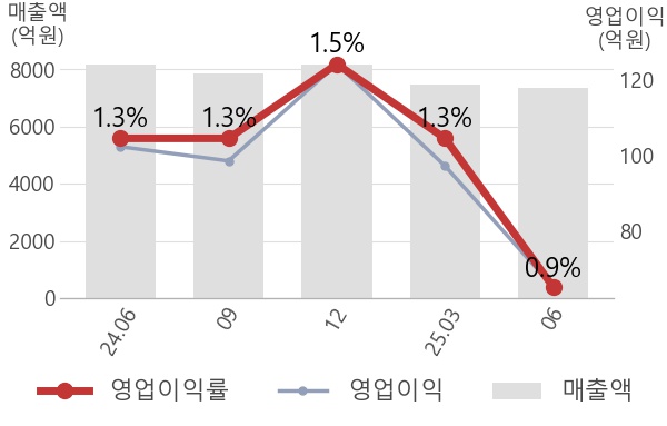 영업이익률을 자세히 살펴보면, 매출은 7355억으로 전년동기 대비해서 9.9% 감소하였고, 영업이익도 65.4억으로 36% 감소하면서 전체적인 실적이 감소한 것을 알 수 있는데, 매출 감소폭에 비해 영업이익 감소폭이 더 커서 영업이익률도 하락한 것을 알 수 있다.