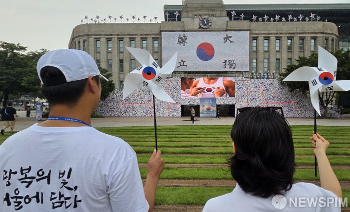 [서울=뉴스핌] 양윤모 기자 = 9일 서울시가 광복 80주년을 앞두고 서울 중구 서울도서관 정문 앞에 가로 45m, 폭 5m, 높이 6m 규모 '태극기 언덕'을 설치한 가운데, 휴일을 맞아 시민들이 광복의 자부심과 기쁨을 되새기고 있다. 2025.08.09 yym58@newspim.com