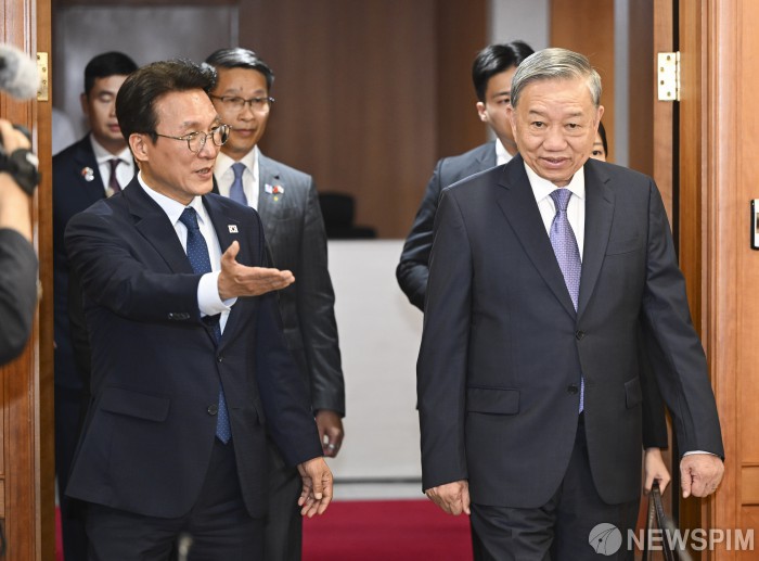 [서울=뉴스핌] 청사사진기자단=김민석 국무총리와 또 럼 베트남 당 서기장이 11일 서울 종로구 정부서울청사에서 면담을 위해 이동하고 있다. 2025.08.11 photo@newspim.com