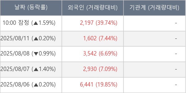 [서울=뉴스핌] 로보뉴스 = 12일 10시 15분 현재 제이엠티(094970)는 전일 대비 1.59% (현재가 2,555원) 상승했고, 외국인이 최근 7일 연속 순매수(누적 47,780주, 잠정) 행진을 하고 있다.