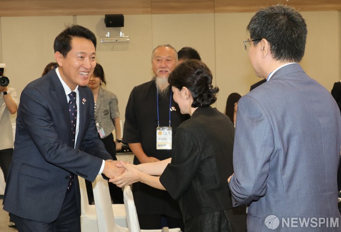 [서울=뉴스핌] 양윤모 기자 = 광복 80주년을 맞아 오세훈 서울시장이 13일 서울시 8층 간담회장에서 개최된 서울시 해외 독립유공자 후손 초청 간담회에 서 참석자들과 악수 하고 있다. 2025.08.14 yym58@newspim.com