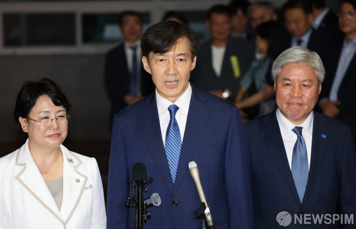 [서울=뉴스핌] 김학선 기자 = 광복절 특별 사면으로 석방된 조국 전 조국혁신당 대표가 15일 자정 서울남부교도소에서 나와 대국민 인사 발표를 하고 있다. 2025.08.15 yooksa@newspim.com