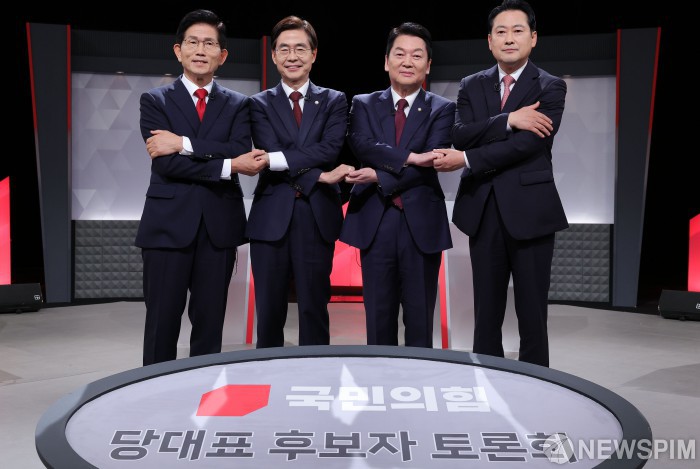 [서울=뉴스핌] 양윤모 기자 = 국민의힘 당대표 후보들이 17일 서울 여의도 KBS에서 열린 2차 TV토론회에 앞서 포즈를 취하고 있다. 김문수(왼쪽부터), 조경태, 안철수, 장동혁 국민의힘 당대표 후보 [국회사진기자단] 2025.08.17 yym58@newspim.com