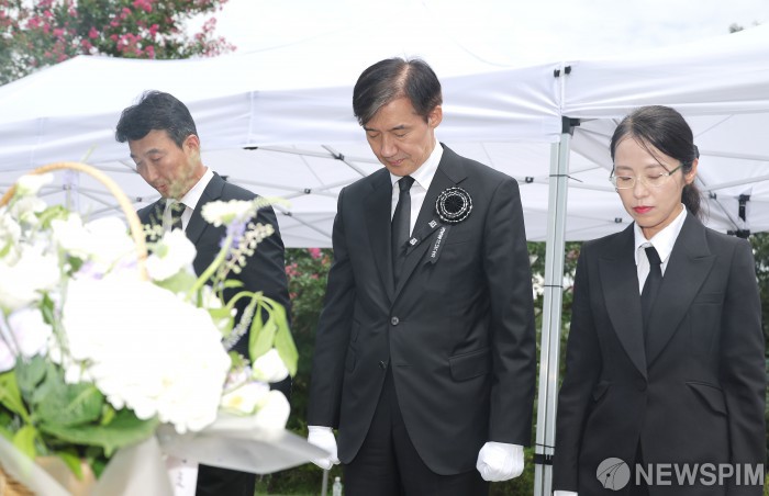 [서울=뉴스핌] 김학선 기자 = 조국혁신당 조국 전 대표가 18일 서울 동작구 국립서울현충원 내 김대중 전 대통령 묘역을 찾아 참배를 하고 있다. 2025.08.18 yooksa@newspim.com