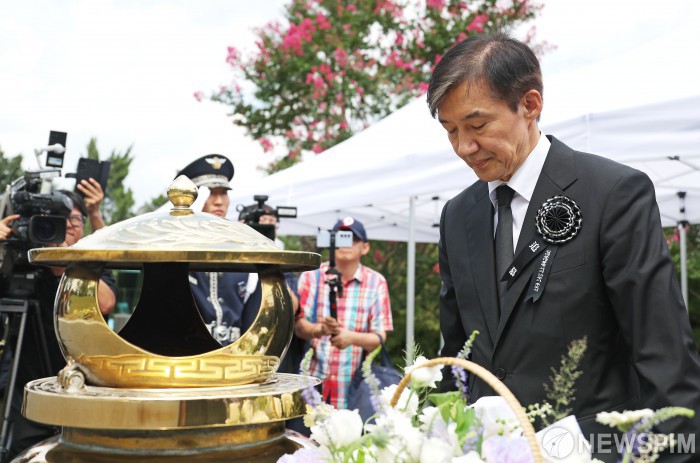 [서울=뉴스핌] 김학선 기자 = 조국혁신당 조국 전 대표가 18일 서울 동작구 국립서울현충원 내 김대중 전 대통령 묘역을 찾아 참배를 하고 있다. 2025.08.18 yooksa@newspim.com