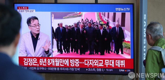 | [서울=뉴스핌] 김학선 기자 = 3일 서울 중구 서울역에 설치된 TV에 중계되는 중국 전승절 열병식 행사에서 시진핑 중국 국가주석과 블라디미르 푸틴 러시아 대통령, 김정은 북한 국무위원장이 참석한 장면이 나오고 있다. 2025.09.03 yooksa@newspim.com |