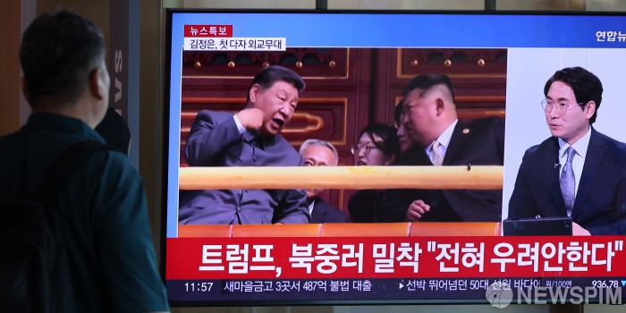 | [서울=뉴스핌] 김학선 기자 = 3일 서울 중구 서울역에 설치된 TV에 중계되는 중국 전승절 열병식 행사에서 시진핑 중국 국가주석과 김정은 북한 국무위원장이 톈안먼 망루에서 대화하는 장면이 나오고 있다. 2025.09.03 yooksa@newspim.com |