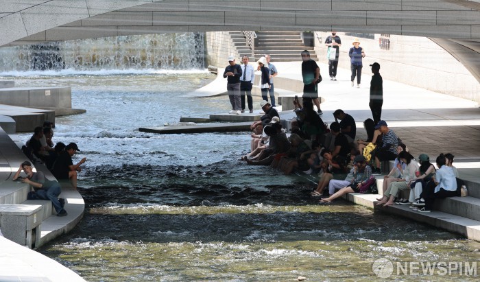 [서울=뉴스핌] 김학선 기자 = 서울 등 중부 곳곳에 폭염경보가 내려진 22일 오후 서울 청계천을 찾은 시민과 외국인들이 물가에 발을 담그고 더위를 식히고 있다. 2025.08.22 yooksa@newspim.com