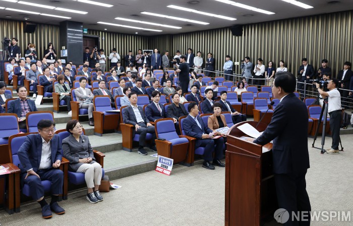 [서울=뉴스핌] 정일구 기자 = 송언석 국민의힘 비상대책위원장 겸 원내대표가 25일 오전 서울 여의도 국회에서 열린 의원총회에서 모두발언을 하고 있다. 2025.08.25 mironj19@newspim.com