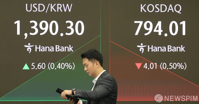 [서울=뉴스핌] 양윤모 기자 = 미국 워싱턴DC 백악관에서 이재명 대통령과 도널드 트럼프 대통령의 첫 한미 정상회담이 개최된 가운데, 26일 오전 코스피가 전장 종가보다 14.17포인트(0.44%) 하락하며 3195.69로, 코스닥은 4.01포인트(0.50%) 하락한 794.01로 시작한 가운데, 서울 중구 하나은행 딜링룸에서 직원들이 업무를 보고 있다. 서울외환시장에서 원·달러 환율은 전장 대비 5.60원 상승한 1390.30원에 거래를 시작했다. 2025.08.26 yym58@newspim.com