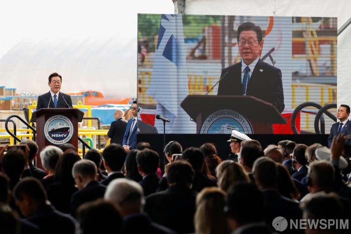 [펜실베이니아 로이터=뉴스핌] 이재명 대통령이 26일(현지시간) 미국 펜실베이니아주 필라델피아에 위치한 한화 필리 조선소에서 열린 '스테이트 오브 메인'호 명명식에서 발언을 하고 있다. 2025.08.27 photo@newspim.com