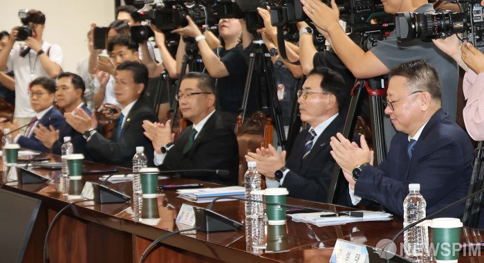 [서울=뉴스핌] 양윤모 기자 = 28일 오후 서울 중구 은행회관에서 이찬진 금융감독원장과 첫 국내 은행장 간담회이 취임 2주 만에 개최됐다. 이 자리에는 조용병 은행연합회장,이환주 KB국민은행장, 정상혁 신한은행장, 이호성 하나은행장, 정진완 우리은행장, 김성태 기업은행장, 강태영 NH농협은행장 등 시중은행과 지방은행,인터넷은행의 은행장이 참석했다. 2025.08.28 yym58@newspim.com