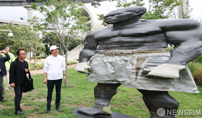 [서울=뉴스핌] 최지환 기자 = 오세훈 서울시장이 1일 오후 서울 광진구 뚝섬한강공원에서 열린 제2회 서울조각페스티벌 개막식에서 전시 작품을 둘러보고 있다. 서울시는 오는 11월 30일까지 뚝섬한강공원, 서울식물원, 보라매공원 등에서 100여점의 야외 조각작품을 선보이는 제2회 서울조각페스티벌을 진행한다. 2025.09.01 choipix16@newspim.com