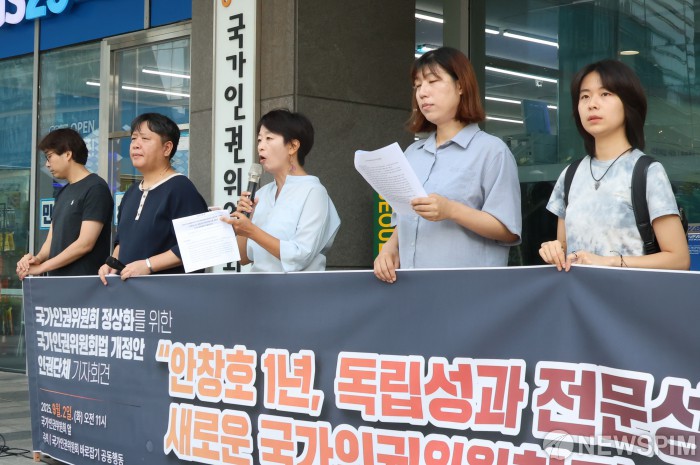 [서울=뉴스핌] 양윤모 기자 = 국가인권위원회 바로잡기 공동행동 회원들이 2일 오전 서울 중구 국가인권위원회 앞에 앞에서 인권위 정상화를 위한 국가인권위원회법 개정안 촉구 기자회견을 개최했다. 2025.09.02 yym58@newspim.com