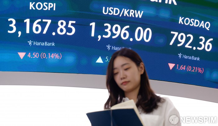 [서울=뉴스핌] 류기찬 기자 = 코스피가 상승세로 거래를 시작한 3일 오전 서울 중구 하나은행 딜링룸 전광판에 코스피, 원/달러 환율, 코스닥 지수가 표시되고 있다. 이날 코스피 지수는 전장 대비 5.4포인트(0.17%) 오른 3177.75에, 코스닥 지수는 0.72포인트(0.09%) 내린 793.28에 장을 시작했다. 원/달러 환율은 전장보다 4.2원 오른 1395.2원으로 출발했다. 2025.09.03 ryuchan0925@newspim.com