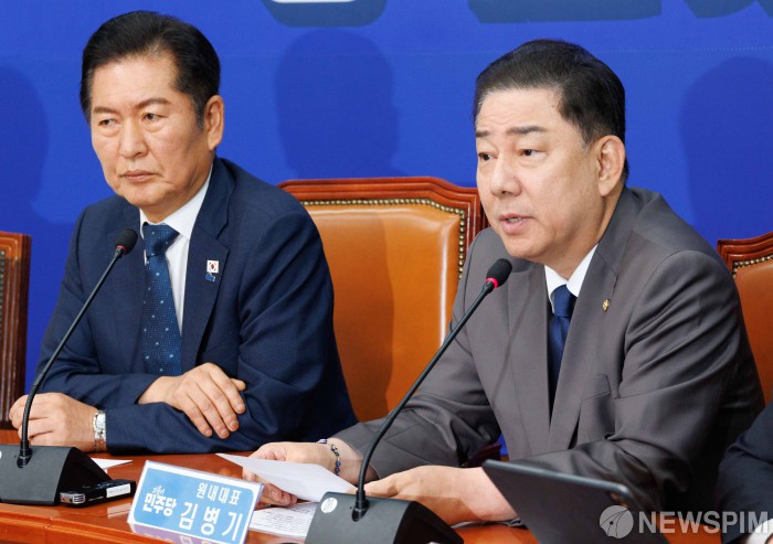 [서울=뉴스핌] 윤창빈 기자 = 김병기 더불어민주당 원내대표가 3일 오전 서울 여의도 국회에서 열린 최고위원회의에서 모두발언을 하고 있다. 2025.09.03 pangbin@newspim.com
