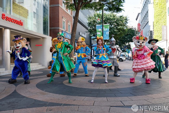 [서울=뉴스핌] 류기찬 기자 = 판타지 소설 오즈의 마법사 캐릭터들이 3일 오전 서울 중구 명동거리에서 댄스 공연을 펼치고 있다. 이번 행사에서는 도로시, 겁쟁이 사자, 양철 나무꾼, 허수아비 등 오즈의 마법사 캐릭터들과 에버랜드 캐릭터인 레니, 라라가 참여했다. 에버랜드는 오는 9월 5일부터 11월 16일까지 두 달여간 가을 축제인 '에버랜드 오브 오즈'를 개최한다. 2025.09.03 ryuchan0925@newspim.com