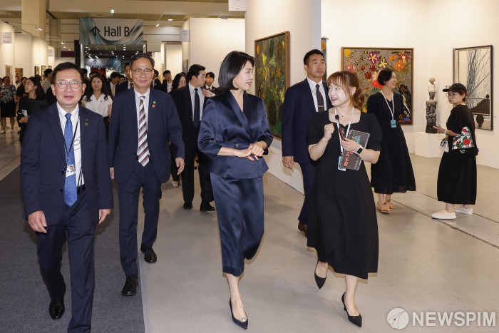 [서울=뉴스핌] 정일구 기자 = 이재명 대통령 부인 김혜경 여사가 3일 오전 서울 강남구 코엑스에서 열린 '키아프 서울 2025' 페어 투어 행사에서 전시 작품들을 관람하고 있다. 2025.09.03 mironj19@newspim.com