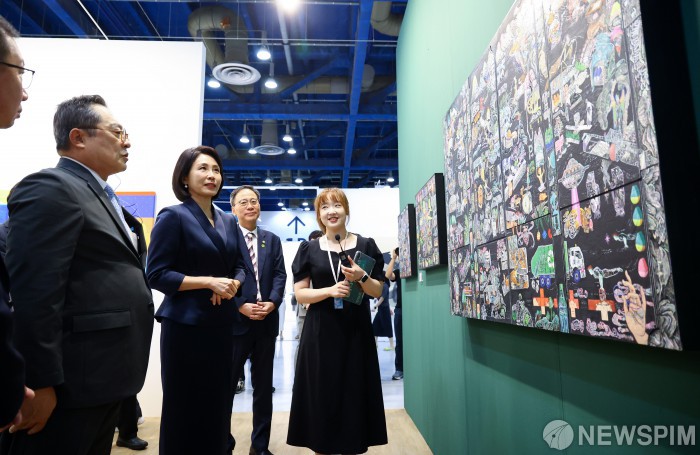 [서울=뉴스핌] 정일구 기자 = 이재명 대통령 부인 김혜경 여사가 3일 오전 서울 강남구 코엑스에서 열린 '키아프 서울 2025' 페어 투어 행사에서 전시 작품들을 관람하고 있다. 2025.09.03 mironj19@newspim.com