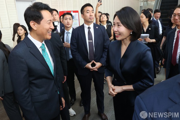 [서울=뉴스핌] 정일구 기자 = 이재명 대통령 부인 김혜경 여사와 오세훈 서울시장이 3일 서울 강남구 코엑스에서 열린 '프리즈 서울 2025' 페어 투어 행사에서 인사를 나누고 있다. 2025.09.03 mironj19@newspim.com