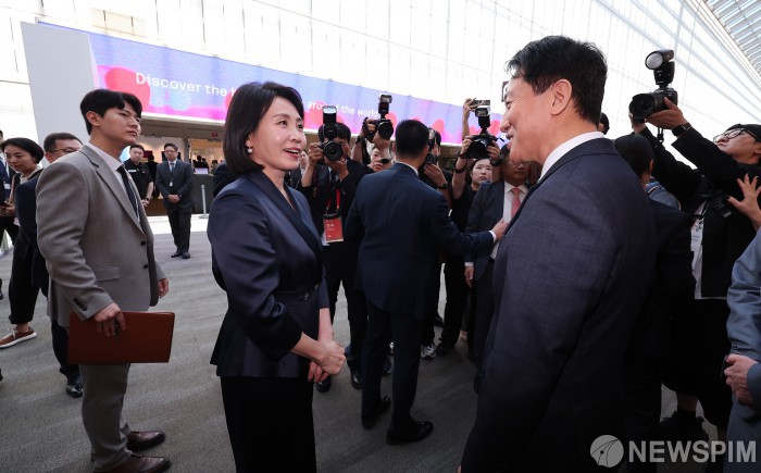 [서울=뉴스핌] 정일구 기자 = 이재명 대통령 부인 김혜경 여사와 오세훈 서울시장이 3일 서울 강남구 코엑스에서 열린 '프리즈 서울 2025' 페어 투어 행사에서 인사를 나누고 있다. 2025.09.03 mironj19@newspim.com