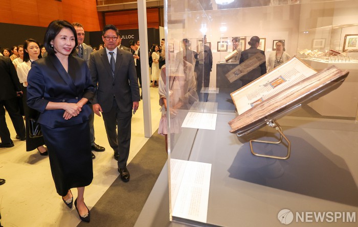 [서울=뉴스핌] 정일구 기자 = 이재명 대통령 부인 김혜경 여사가 3일 오전 서울 강남구 코엑스에서 열린 '프리즈 서울 2025' 페어 투어 행사에서 전시 작품들을 관람하고 있다. 2025.09.03 mironj19@newspim.com