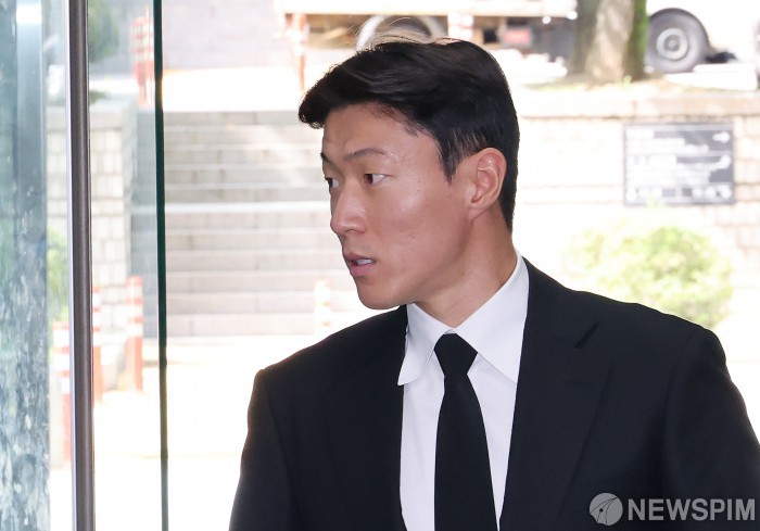 [서울=뉴스핌] 정일구 기자 = 불법 촬영 혐의로 1심에서 징역형의 집행유예를 선고받은 축구선수 황의조가 4일 오후 서울 서초구 서울중앙지방법원에서 열린 항소심 선고 공판에 출석하고 있다. 2025.09.04 mironj19@newspim.com